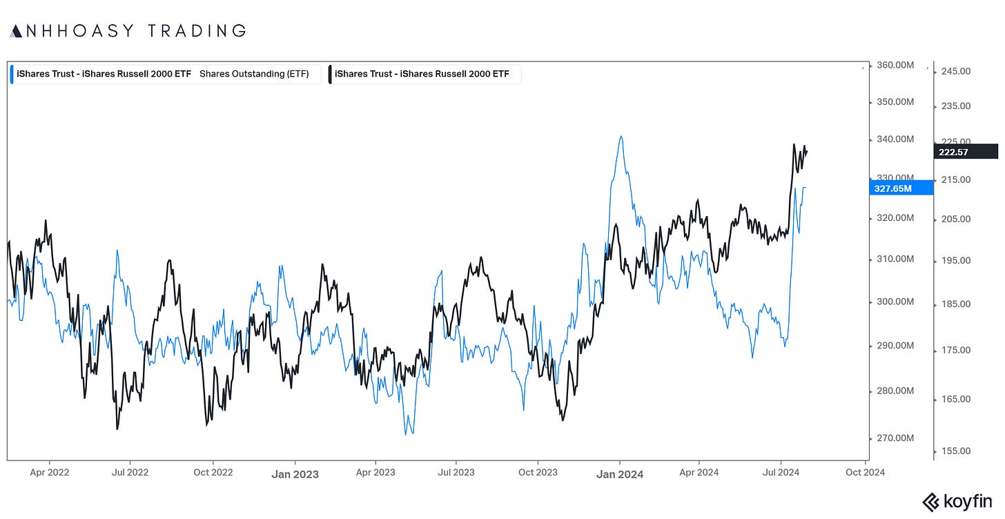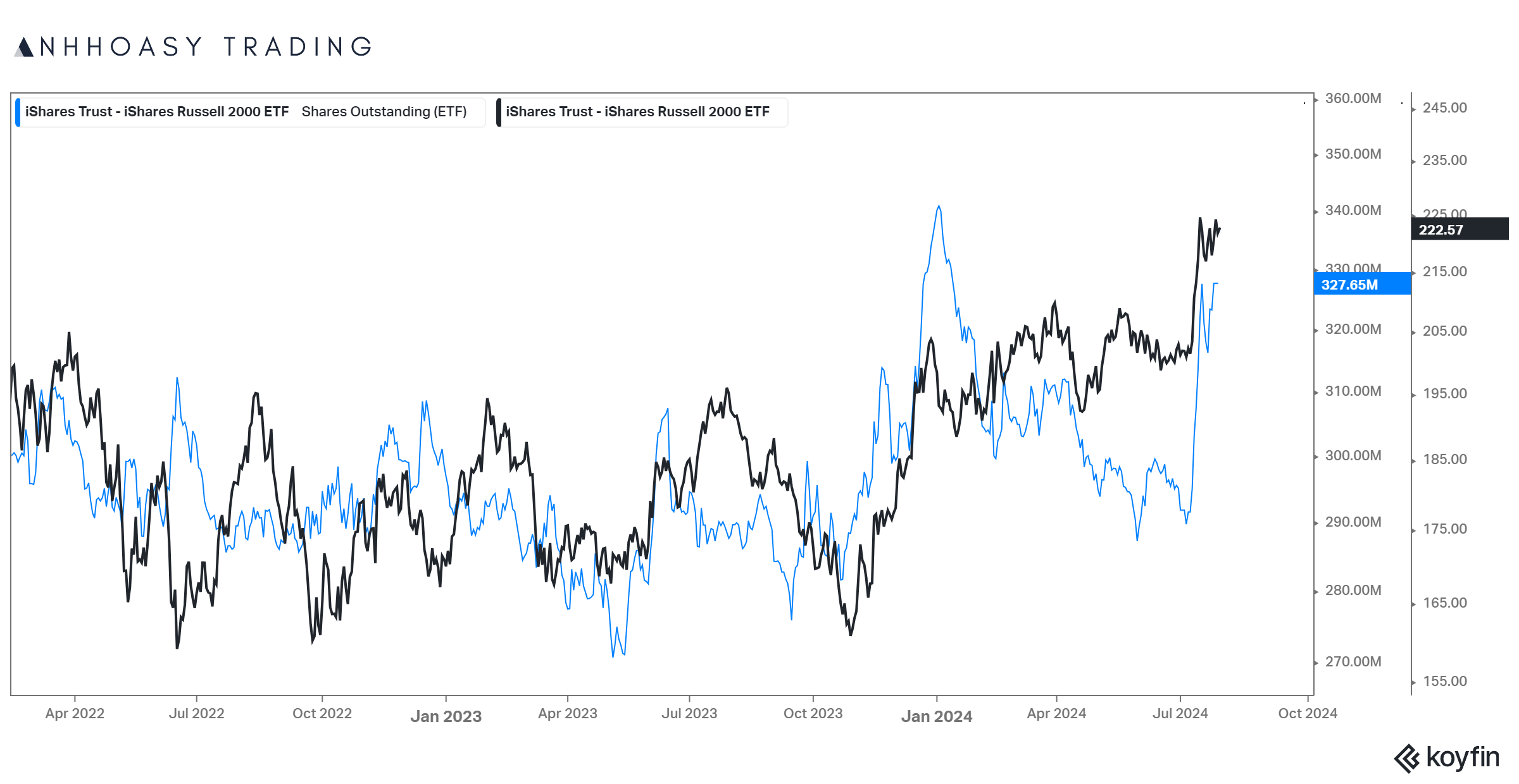 Share outstanding của IWM cũng tăng lên mức 327.66M, tuy cao nhưng vẫn thấp hơn đỉnh hồi tháng 1 2024.