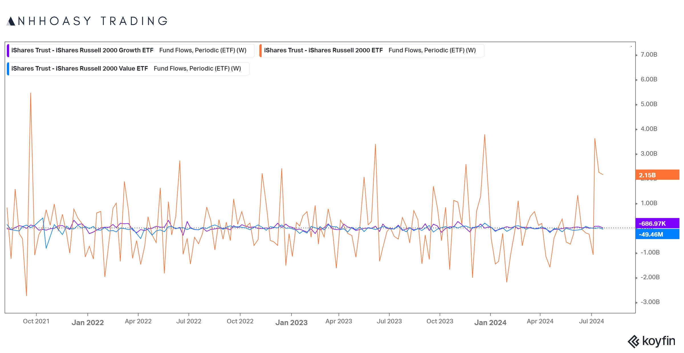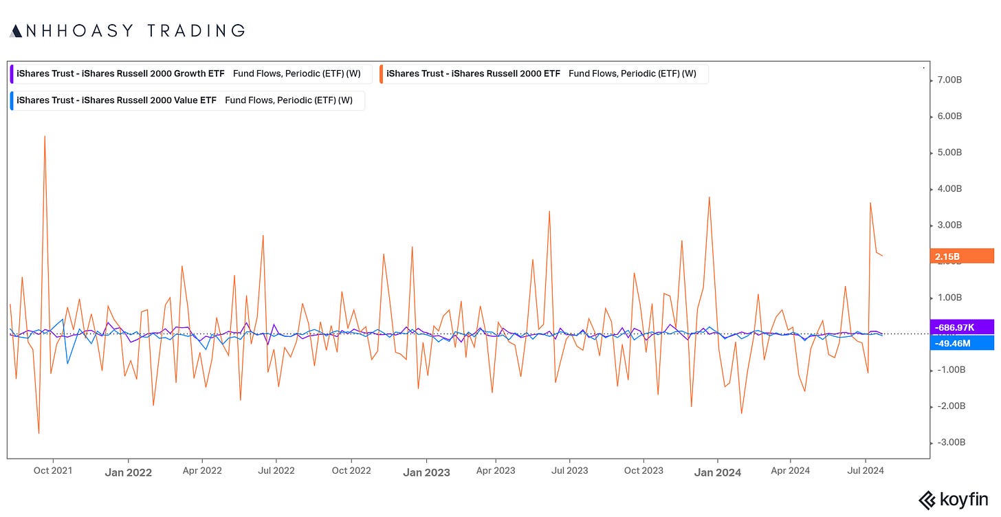 Flows vào small cap chủ yếu là ở IWM. Không giống rotation thực sự cho lắm.