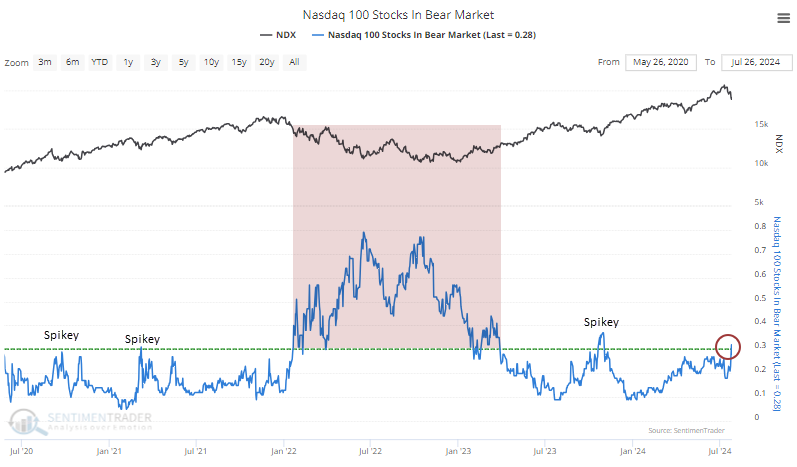 % cổ phiếu trong chỉ số Nasdaq 100 đang ở trong bear market đã tăng lên mức >30%, mức cao nhất trong hơn 6 tháng qua. Nhìn vào chart chúng ta có thể thấy trong bull market, % cổ phiếu trong bear market thường nằm dưới 30%, và mỗi khi con số này spike quá ngưỡng 30% cũng là lúc index tạo đáy, kết thúc đợt điều chỉnh.